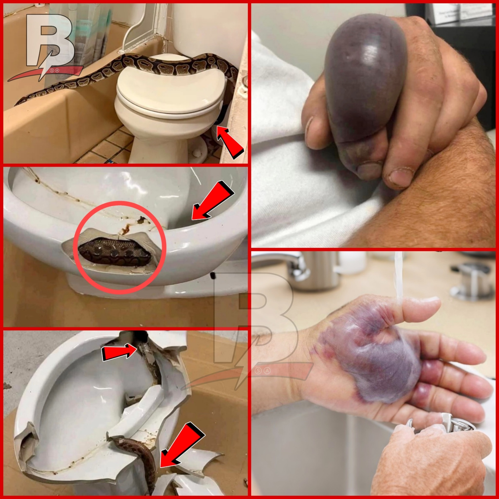 A python emerging from a toilet bowl, illustrating global snake intrusions.